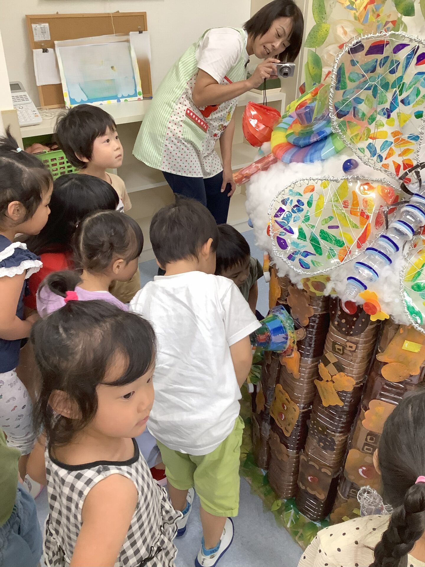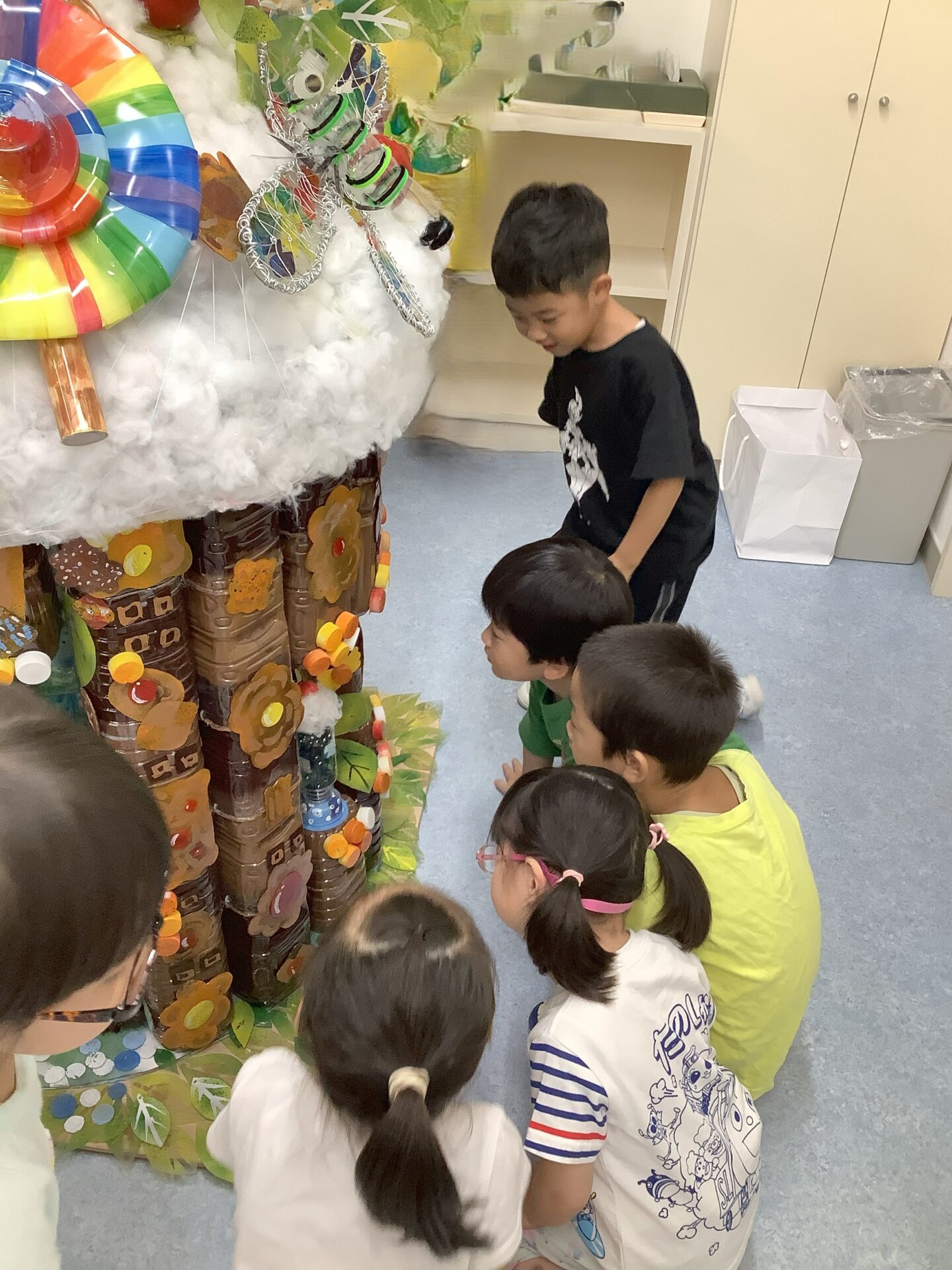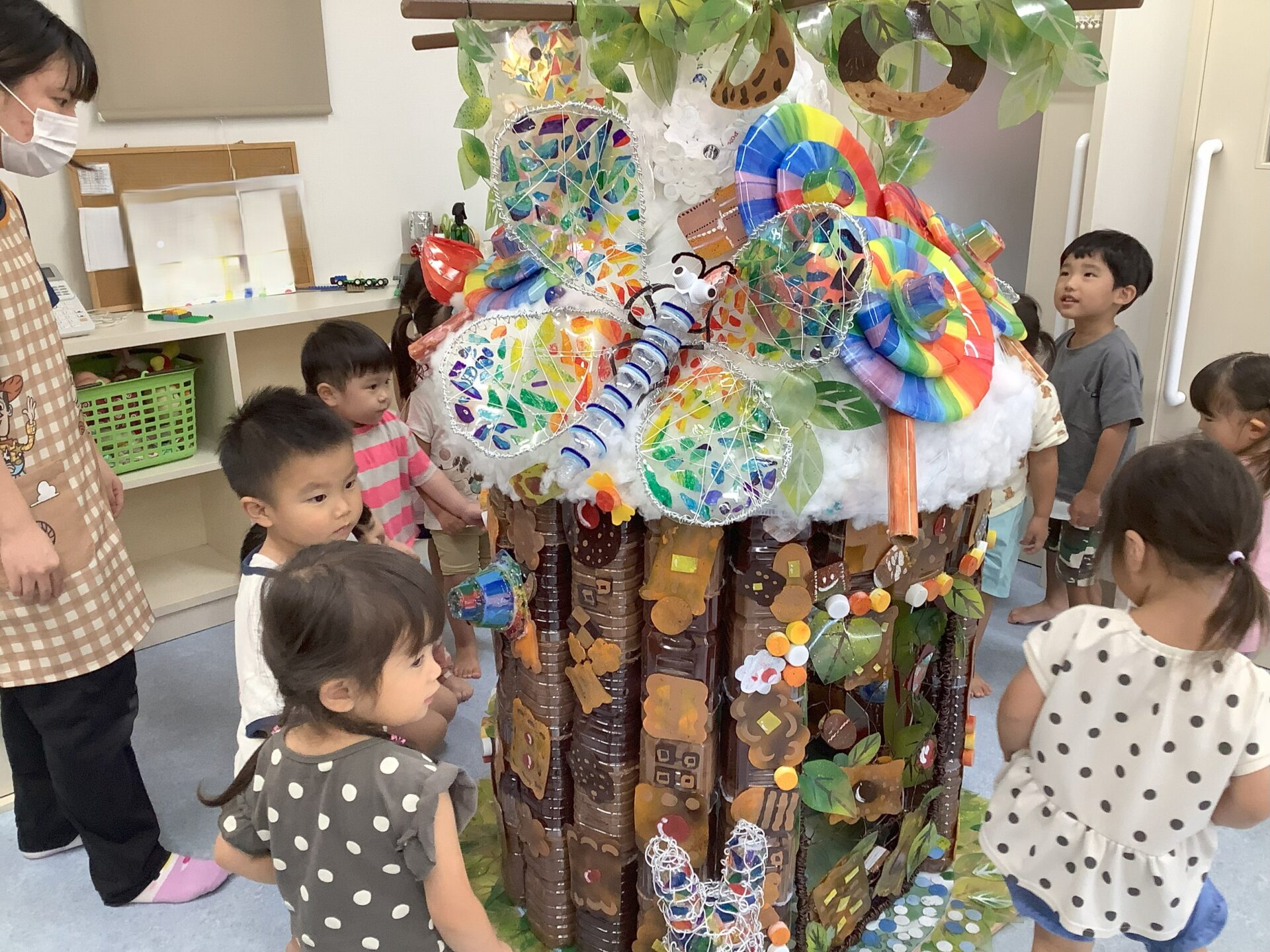 廃材の協力をしてくださった、保護者様、こども園の先生方のおかげで作品が完成しました。