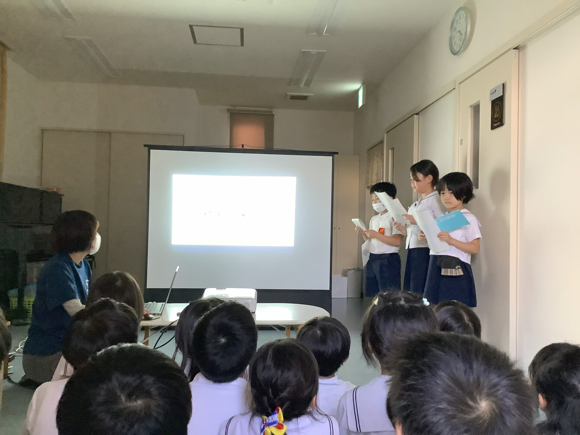 こども園の子ども達と児童クラブが会に参加し、制作を担当した3年生3名が、作品の紹介を行いました。