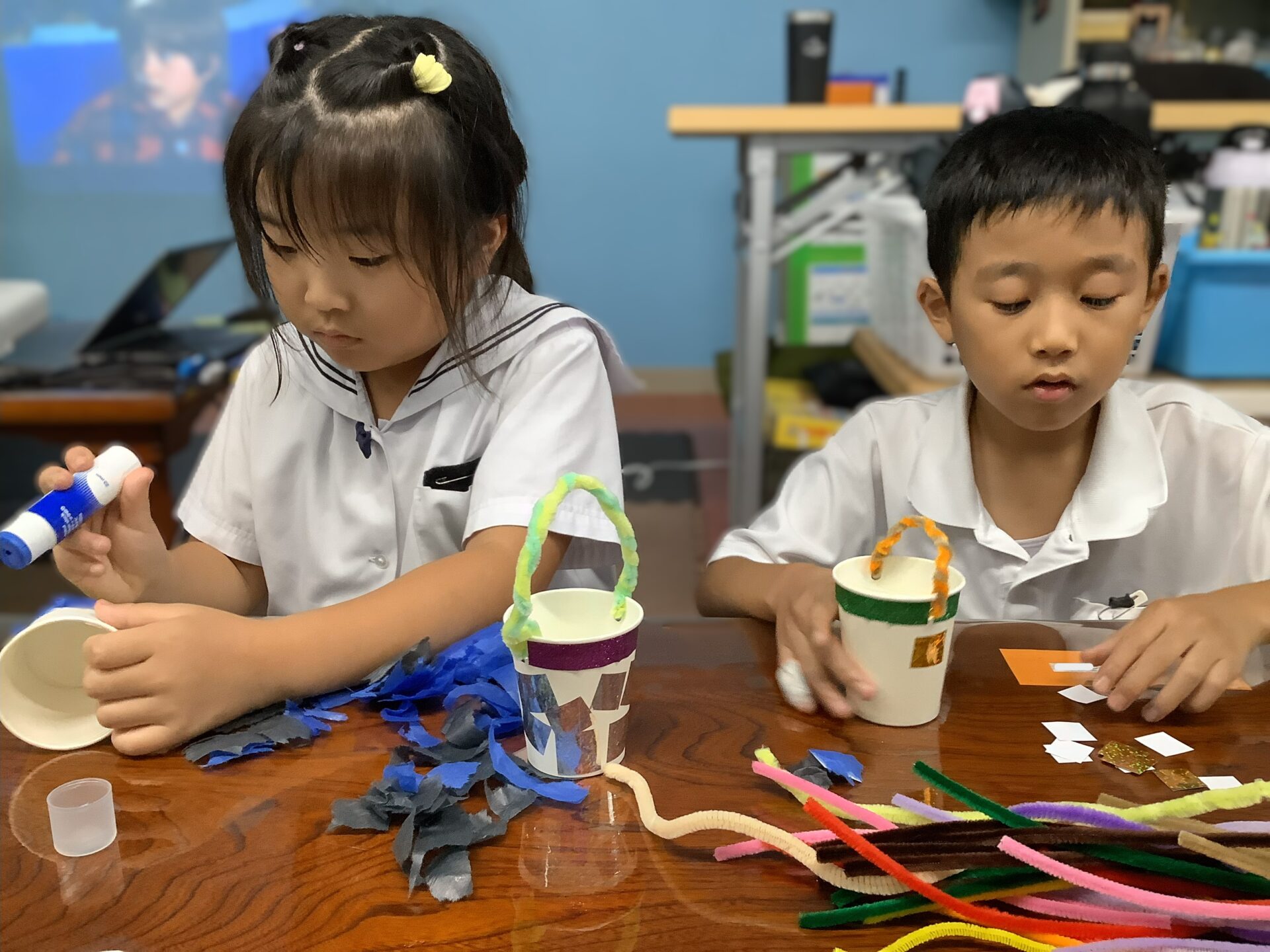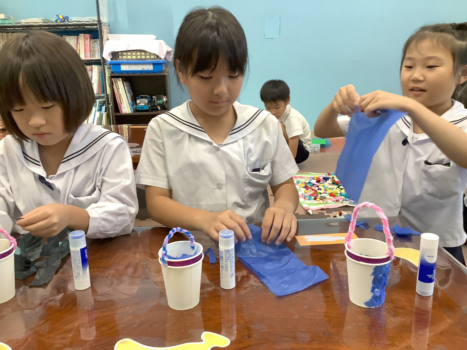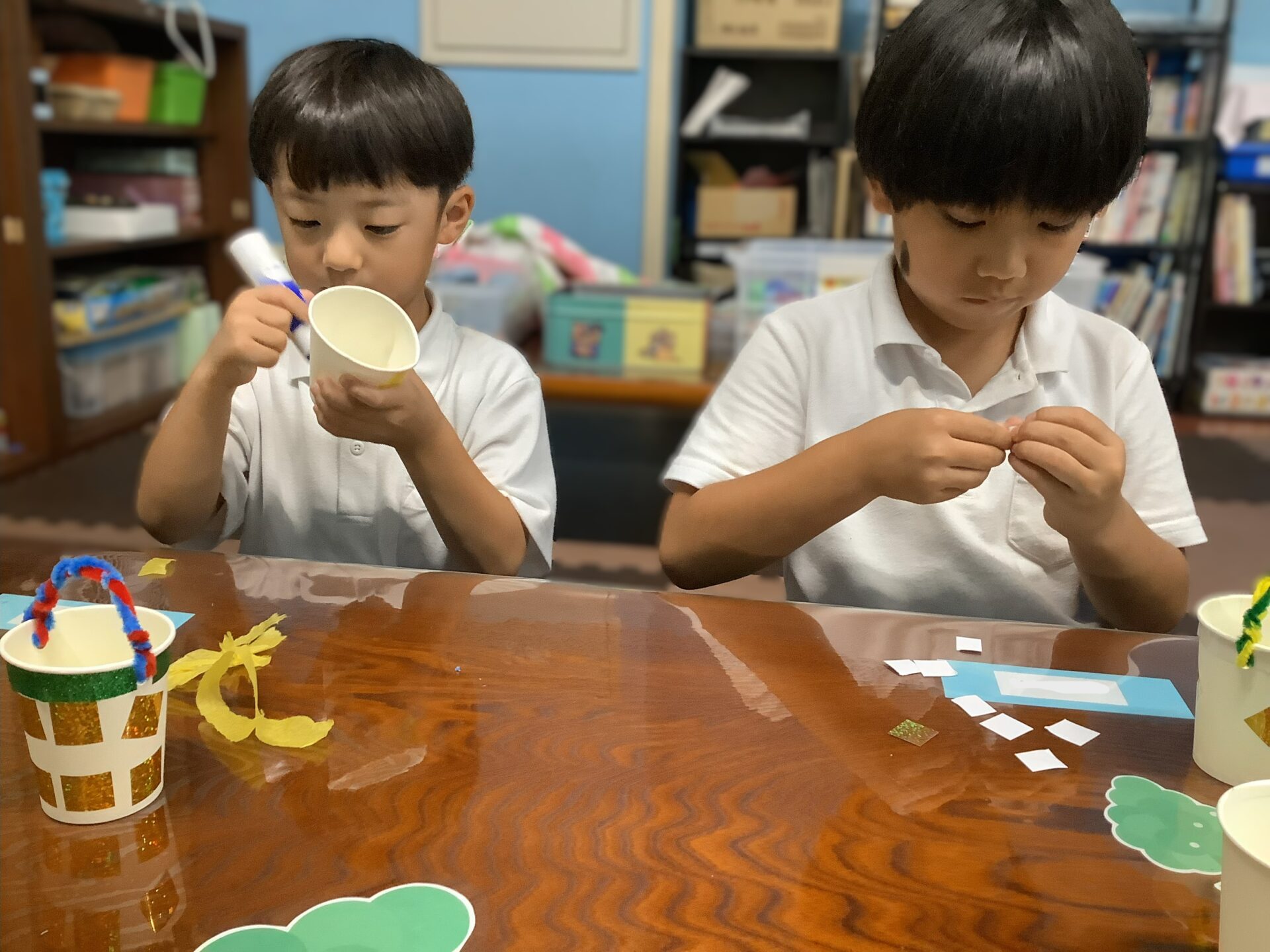 紙コップを使って制作しました。キラキラのシールを貼っていきます✨