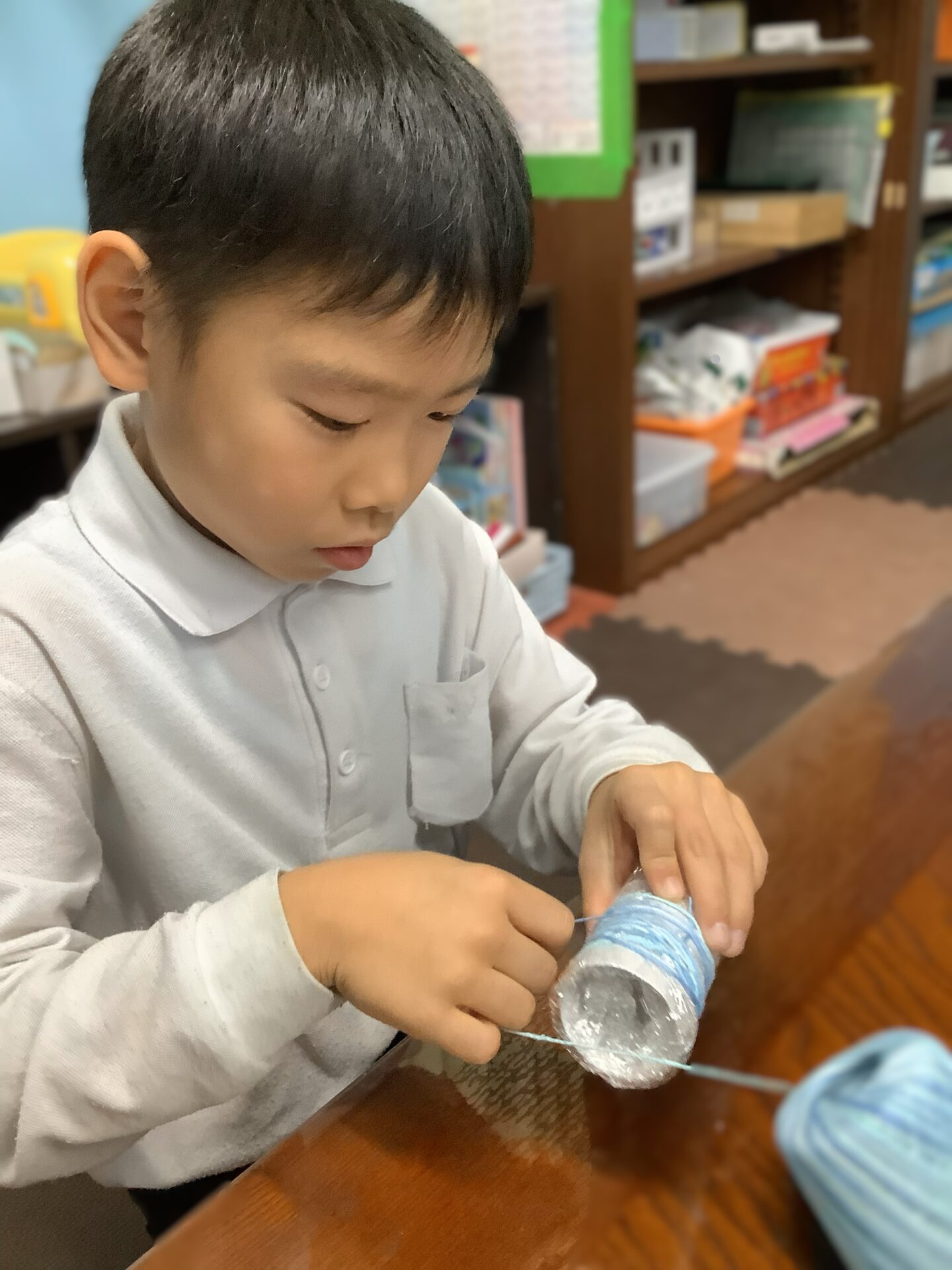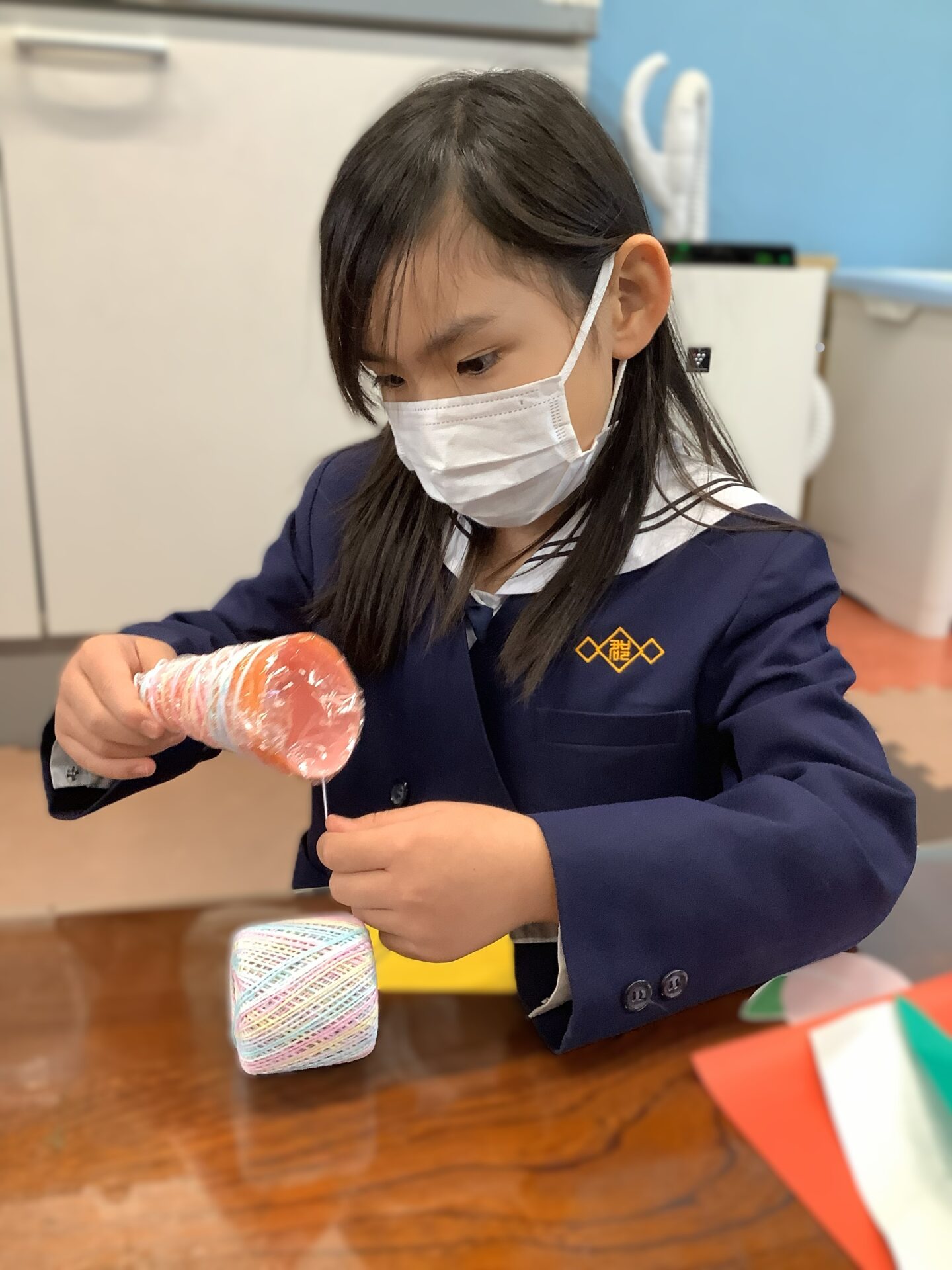 カラフルな糸をグルグル巻き、スノーマンの体やツリーを作っていきます。次に、ボンド液を塗り乾かします。作品が完成したら廊下に飾る予定です。良かったら見てください😊