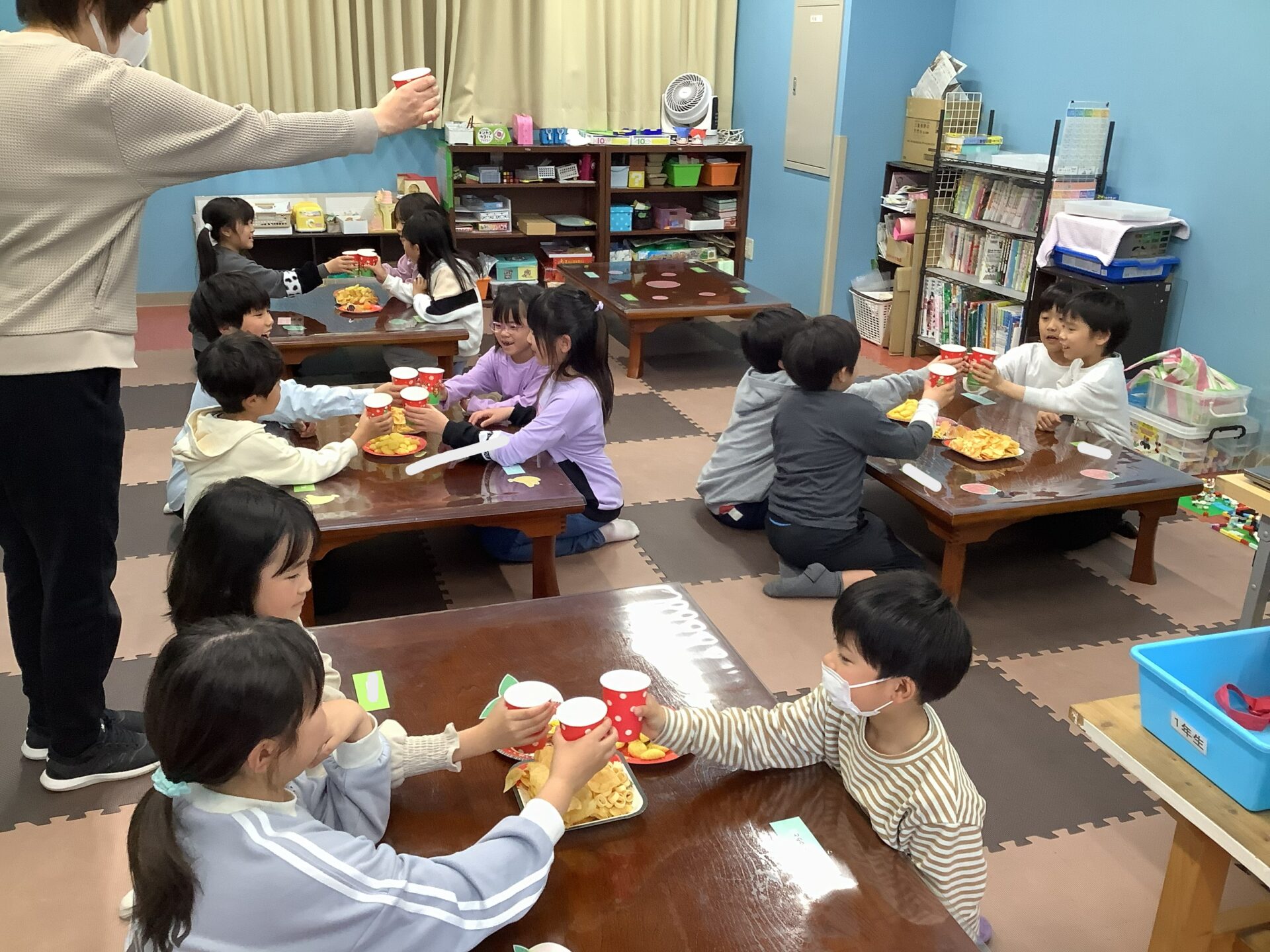 お菓子を前にジュースで「1年間おつかれさま~。かんぱ~い!」と、まるで打ち上げのようです。